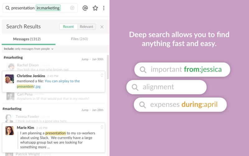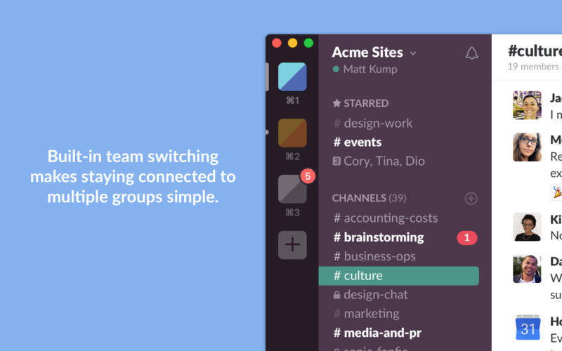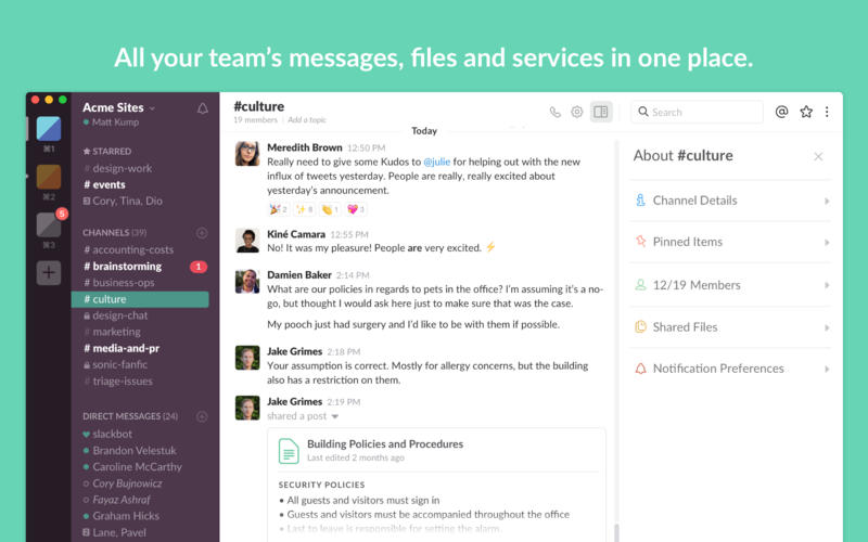 Slack for mac是Mac os平台上的一款整合了聊天群组 + 大规模工具集成 + 文件整合 + 统一搜索的Mac社交通讯软件,目前,Slack for mac已经整合了电子邮件、短信、Google Drives、Twitter、Trello、Asana、GitHub 等 65 种工具和服务。【软件特点】