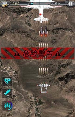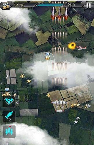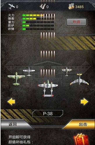 这是一款空战游戏,通过手指控制飞机,上下左右移动来躲避敌机攻击和射击敌机,游戏一开始只能从第一关“蓝色浅滩”开始,点击“出击”即可进入战机选择界面,p-38是系统默认机型