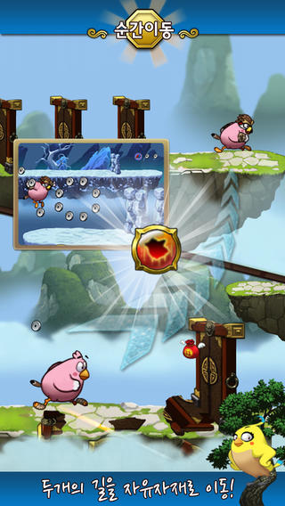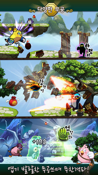 功夫小鸟游戏的画面为2D平面场景设计,游戏中玩家将会感受到是一款传统经典的动作游戏,虽然在界面中为韩文标注,在语言障碍上有较大的问题,但是并不会让大家疏远这款游戏,更多的是对本款游戏的贴切和熟悉,这就得得益于本款游戏的画面场景的简易通俗设计;为了将本款游戏富有特点,游戏中采用了远近两段场景的切换,让传统单线的横版动作冒险类游戏改为了双跑道,那么该如何切换,小编会在下一段“游戏操作玩法”会有详细地解述。为了能够将双道场景间的衔接流畅,就不得不将游戏的场景设计得更为精巧机妙,增强游戏的视觉感染力。所以本款游戏的相关游戏画面绝对的让玩家们感到舒适、有兴趣。