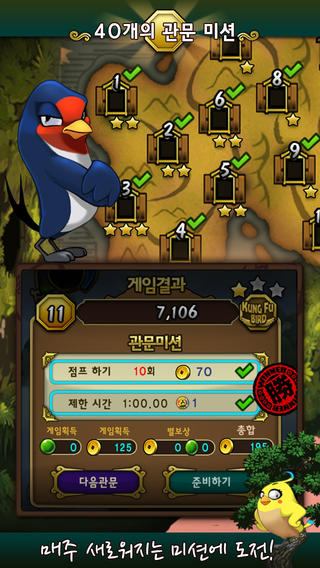 游戏名为《功夫小鸟》( Kong Fu Bied for Kakao)本款游戏是一款NEXT FUTURE开发商制作的纯韩文的功夫题材的动作、跑酷类游戏。游戏中,玩家将会操控一只大胖鸟来接受学习功夫所必经的种种考验。