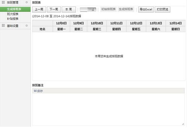 (4.2)点击上一周、下一周、本周按钮则进入到对应周,点击编辑/只读滑动按钮(注意显示只读则当前班排班表不能修改,如果要修改则点周编辑滑动块按钮切换到编辑状态切换到编辑状态,点击”生成排班表“按钮则对应周排班表会自动生成。