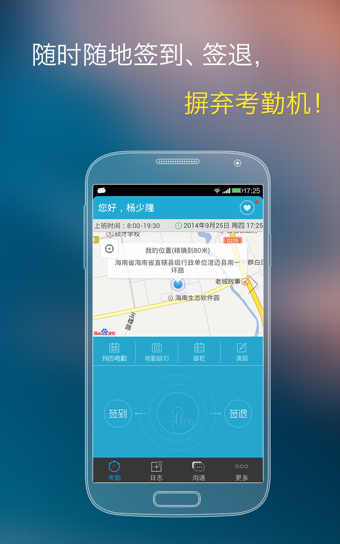 手机端采用GPS、Wi-Fi、基站三种定位技术,智能选择定位方式,使用户在不同环境下,均可精准定位,轻松完成上下班打卡、请假审批、工作日志填报、同事沟通等诸多操作。