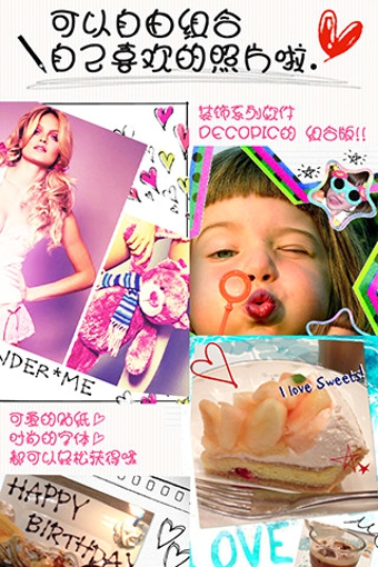 能够随你喜好将照片剪切成心形、星形等各种形状的剪贴画? 可以便捷设定待机画面和图标了哟! 大头贴系列排行No.1的DECOPIC的姊妹软件?
