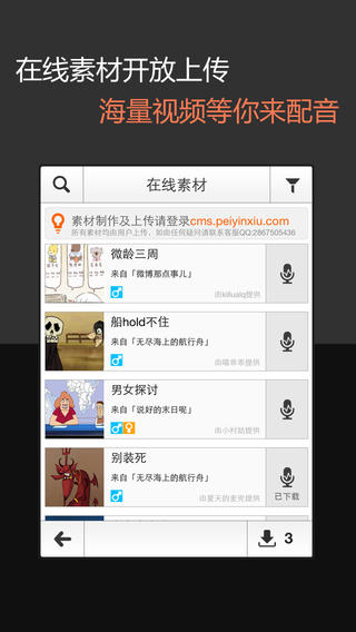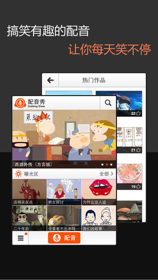 【看视频】看看配音高手们的作品,搞笑的、创意的、模仿的,各种有趣的视频应有尽有,每天让你捧腹大笑、惊喜不断!【玩配音】看着不过瘾?自己也来玩玩,每天都会更新很多好玩的配音素材,加上便捷的配音功能,让你轻松搞定一部属于自己的大作;