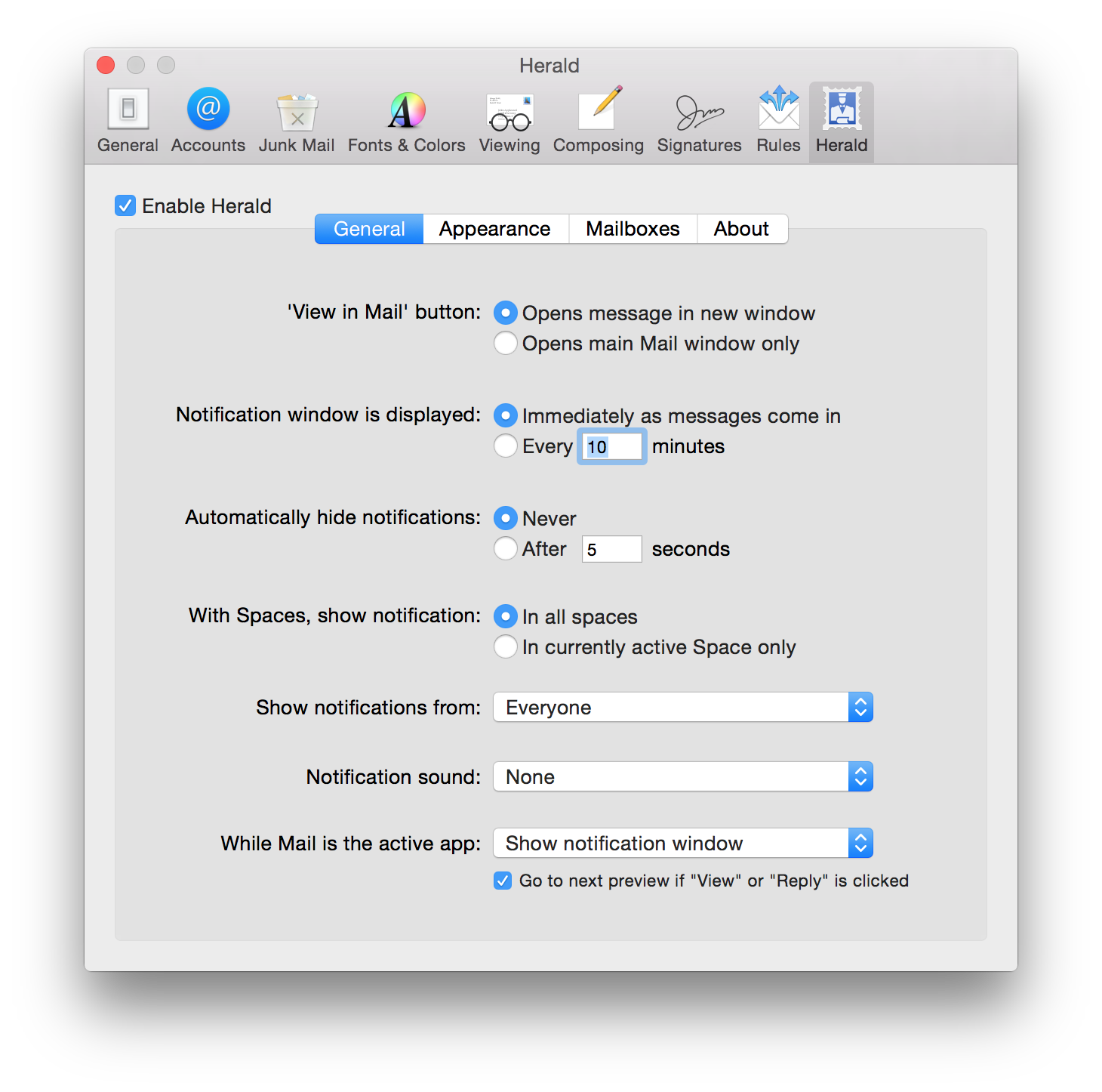 先驱的外观是高度可定制,让你改变背景颜色,文字颜色,大小,阴影,透明度和位置的窗口。报道甚至还提供了一个滚动的文本视图,因此您可以阅读完整的信息,而无需切换回邮件。使者是一个免费下载,需要OS X10.10优胜美地。
