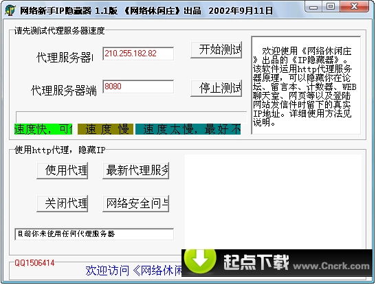 网络新手IP隐藏器 V1.10 简体中文绿色免费版 该软件运用http代理服务器原理,可以隐藏网络新手在论坛、留言本、计数器、WEB聊天室、网页等以及登陆网站发信件时留下的真实IP地址。中文界面,简单易懂,具有“一键代理”的感觉,并且可以随时在线查询最新代理服务器,还可以查询QQ代理服务器(QQ上隐藏IP用),特别适合于网络新手上网时隐藏自己的IP时使用