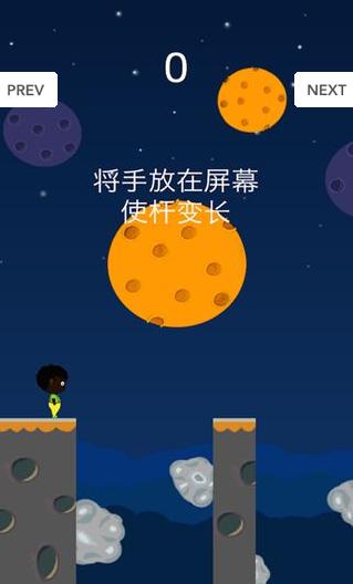 游戏中将手放在屏幕上,搭建棍子,让小英雄用你搭的棍子跨过高台。看看你能走多远?真正表演高空行走的技术来了!!!玩家需要用手指按住屏幕增加英雄手中棍子的长度,然后用棍子跨过一座座的高台。你只需长按屏幕使胖英雄手中的棍子变长顺利通过平台,但是棍子太长你就会越过平台掉下深渊,平台也会时宽时窄,这时候就要小心啦。
