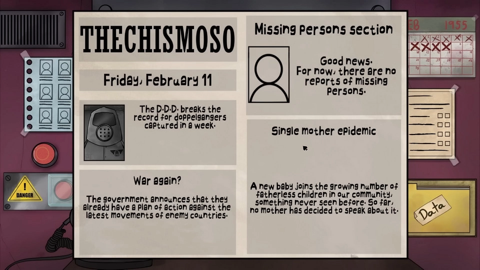 故事起始于1955年,不知出于何种缘由,伪人的活动变得极为频繁。这些伪人具备模仿人类外貌的能力,还妄图混入人类社会。于是,替身侦测局(D.D.D.)展开行动。玩家以新任门卫的身份加入其中,主要职责是对公寓进出人员进行审核。这份工作表面上看似轻松简单,实则暗藏重重危险,任何一丝失误都极有可能让伪人趁机入侵,进而威胁到整栋楼居民的生命安全。因此,玩家必须小心翼翼地对待每一个细节,逐步探寻伪人现象背后隐藏的真相。