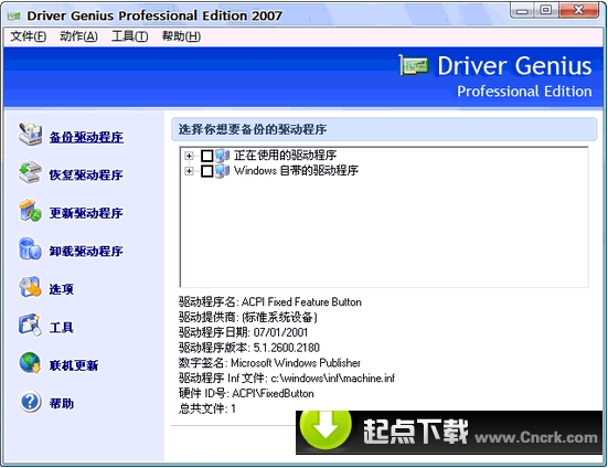 Driver Genius Pro 2010 10.0.0.526 汉化绿色特别版 Driver Genius(驱动精灵) 专业的驱动程序备份工具,能够检测用户计算机系统中的硬件设备,将全部或任意部分硬件的驱动程序提取备份出来,并能够将备份出来的驱动程序做成Zip压缩文件或自解压文件。速度敏捷,这份工作快到只需30秒就能全部完成。通过驱动备份功能,大家可以完全免去重新安装系统后驱动程序丢失的烦恼,多台同配置机器也不再需要那数不胜数的驱动光盘了。