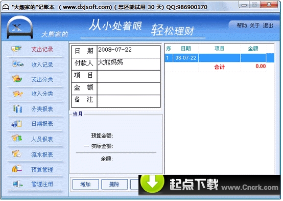 大熊家的记账本可以自已定义界面,支出记录、收入记录、支出分类、收入分类、分类报表、日期报表、人员报表、流水报表预算管理和管理注册、日历功能。支出分类里预设有十几种支出类别及支出项目。各类报表可根据自行设定的时间显示,并且有导出成EXCEL功能,便于打印和保存。