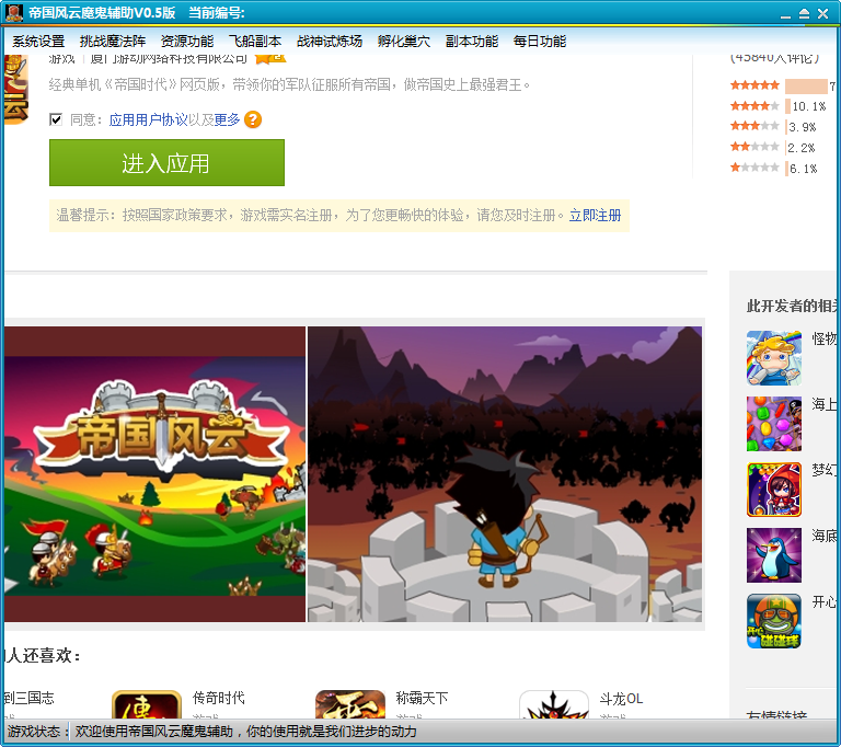 帝国风云魔鬼辅助是一款专为4399flash社区游戏帝国风云游戏打造的辅佐工具。软件功用强壮,具有应战魔法阵,森林竞技,应战天空之城,海王神殿,埃及遗址,孵化巢穴,一键孵化,收取王子等功用。他处理了手动的烦恼,平常活动一键完结。,绿色无敌,无任何广告,期待下载体会。帝国风云是4399游戏开发的一款flash社区游戏。玩家扮演一个帝国君王,从一个小小的村庄,经过发展农业,牧业,矿业等获得大量的资本,具有资本就能够练习强壮的戎行,还能够呼唤奥秘的英豪;利用自己的策略与才智带领戎行消灭来犯的怪物军团,并且能够带领戎行讨伐其他帝国,功成名就!