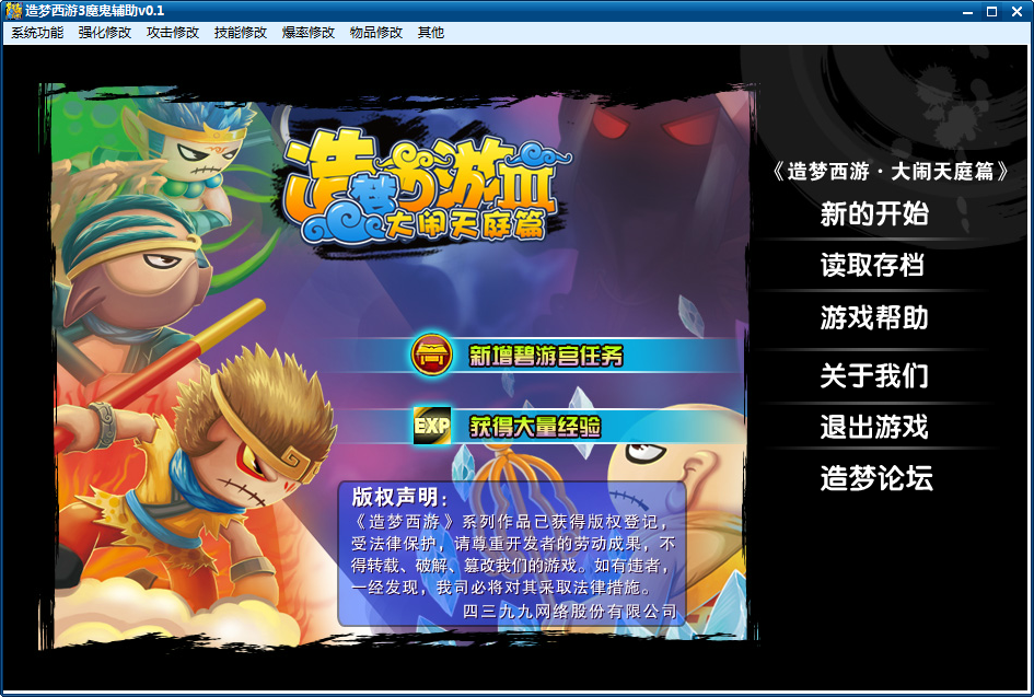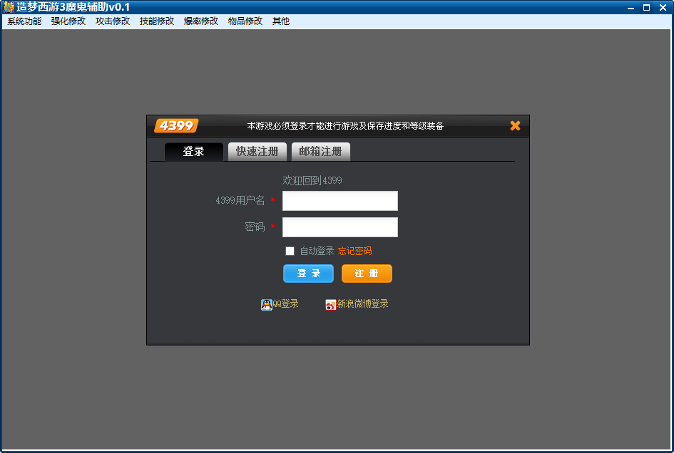 1、启动辅助后先使用4399账号登陆游戏2、进入游戏后,点击辅助上方菜单中的修改功能进行修改