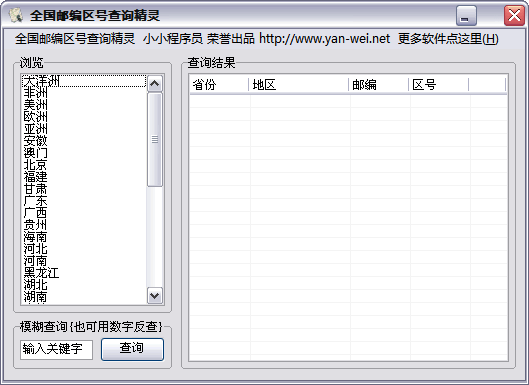 全国邮编区号查询精灵 V1.0 简体中文绿色免费版 全国邮编区号查询精灵可以查询我国所有区县邮编和电话区号,以及部分国家和地区的电话接入码。小巧方便,界面美观,操作灵活。