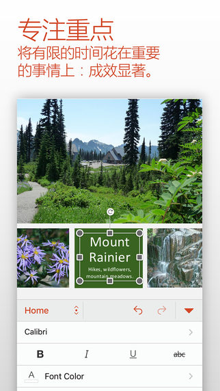 专为 iPad、iPhone 和 iPod touch 设计的 Microsoft PowerPoint 应用。现在,PowerPoint 演示文稿在您的平板电脑和手机上可以更美观地呈现。无论在PC、Mac、平板电脑还是在手机上编辑或创建演示文稿时,演示文稿都会以您想要的方式呈现,您大可放心。PowerPoint 拥有大家熟悉的 Office 界面外观与直观的触控体验,让您立刻轻松上手。