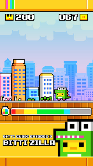 在Bitti Zilla游戏中Bitti Cubbi化身bitti哥斯拉,破坏城市的行动,可以说见楼就拆就人就打,这一路上还会遇到金刚、奥特曼等等电视电影中经典的形象出现阻挡你的去路,若是走慢了就直接扑街了,游戏延续了Bitti Cubbi系列的像素风格,游戏依旧以黄色作为主色调,而主人公则身穿一身哥斯拉的皮进行拆楼行动,这么一身造型总让人想起了现在流行的睡衣派对中妹纸最喜欢的恐龙睡衣,看着它对一栋栋高楼大厦拳打脚踢就显得特别的有趣,而打击音效也相当的欢乐而有节奏,打击感相当的不错。