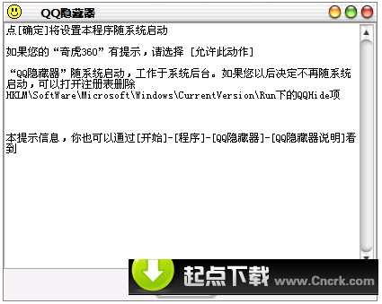 QQ隐藏器 V1.17 简体中文绿色免费版 “QQ隐藏器”启动后,驻留在系统后台,任何时候当您按下Ctrl+Q组合键,“QQ隐藏器”将切换QQ的可见性。也就是说,当您第一次按下Ctrl+Q,QQ消失,再按一次Ctrl+Q,QQ重现。为了使“隐藏”的效果更逼真,当QQ隐藏时,QQ同时被消声,这个时候别人发来消息是不会“滴滴滴滴滴滴”的。这个软件适合于那些背着老板偷偷用QQ的员工,或者背着父母用QQ的子女。本软件会自动设置成随电脑自动启动。请设置360或同类软件准许“QQ隐藏器”将自身添加到系统启动项