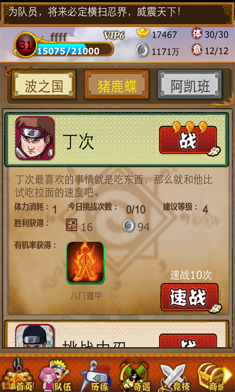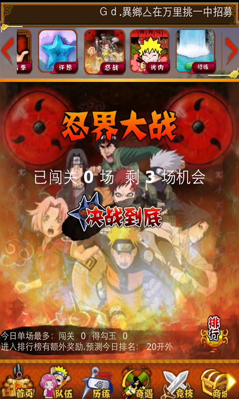 掠夺战是游戏中金币的主要来源。前期如果培养的好,一天光是掠夺资源就可以赚上百万金币。忍界掠夺战心得:多加宿敌同时别忘了多加宿敌,这些宿敌都是后期金币的主要来源。考虑到很多玩家玩过一段时间之后离开游戏,掠夺金币就没有压力了!所以宿敌加越多越好。阵容选择: