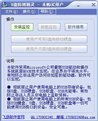 3、软件采用Microsoft公司最新USB驱动和操作系统底层HOOK技术实现,在业界处于领先水平,有效防止非法用户访问你加密的驱动器。
