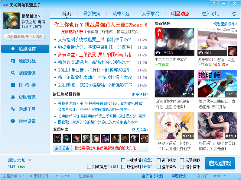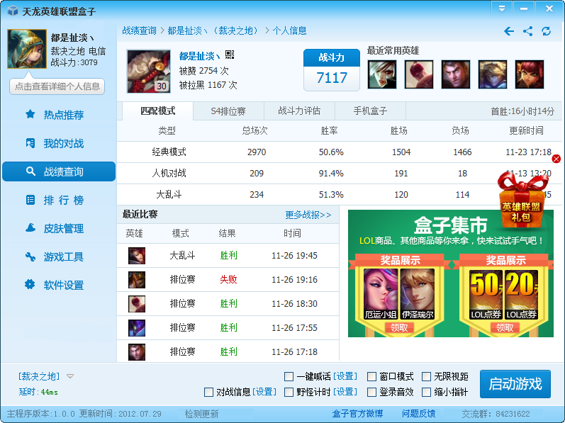 天龙英雄联盟盒子(LOL辅助修改器)是一款绿色免费的由天龙软件官方为英雄对战网游LOL英雄联盟制作的辅助修改工具。软件功能强大,为玩家提供了热点推荐,我的对战,战绩查询,排行榜,皮肤管理,游戏工具等强大功能,的玩家不要错过。【功能介绍】