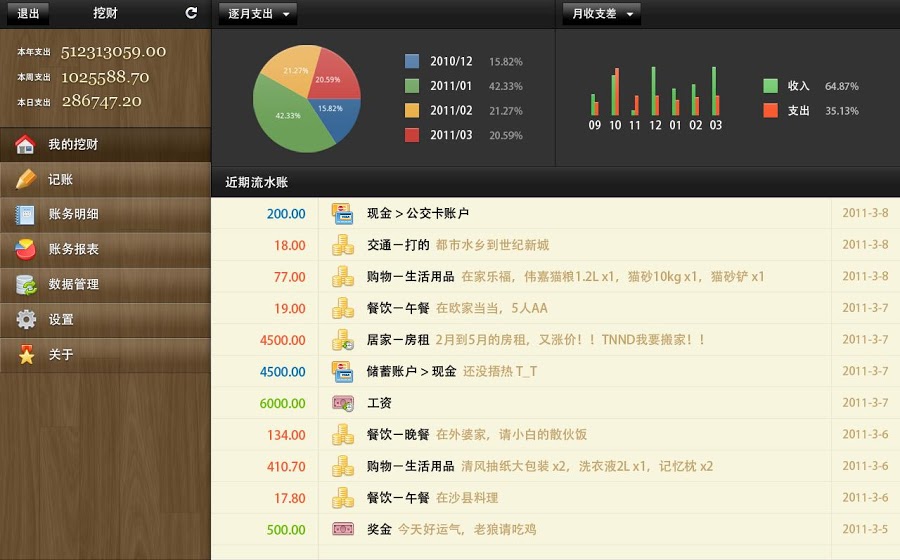 专为Android Pad设计! 挖财,让记账的人更富有! 五星好评,永久免费!史上平台最丰富、支持机型最多、体积小巧、综合表现最优秀的个人记账应用。轻松记账,就用挖财。