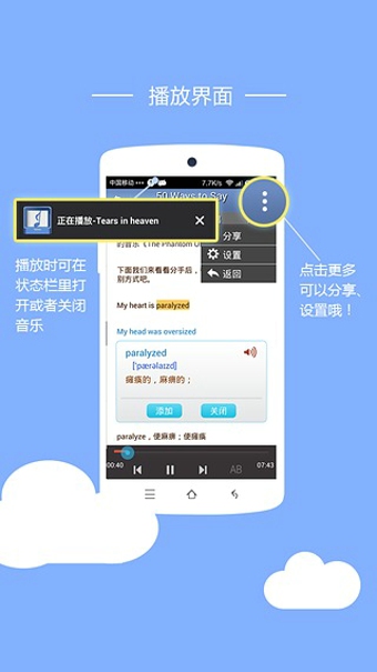 四、 您可以在线听经典歌曲,同时可以将自己喜欢的歌曲下载到本地,方便您在无网络的环境里依旧可以享受并学习优美的英文歌曲。