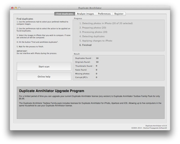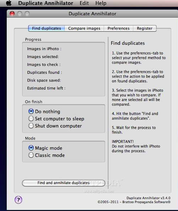 Duplicate Annihilator是iPhoto重复文件删除工具,Duplicate Annihilator需要耗费一些时间,它在你的iPhoto文件库中的采用有效的算法来保证不再有重复的文件。当发现重复文件时,Duplicate Annihilator的处理方式要么是将重复文件按您所选择的描述标记使其可供搜索,要么就是干脆搬到iPhotos垃圾桶。【更新日志】