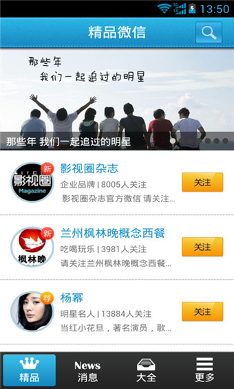 微信助手主要的用途是帮助大家搜集整理一系列微信公众号,便于大家查找。因为大家都知道,现在的微信早已不单单具有聊天功能了,有很多童鞋通过公众号搜集一些有用的资讯,这样就避免了自己去网页漫无目的的查找。微信助手下载安装完成之后,我们在手机上找到这款应用,如图。进去以后,它的主界面有“精品”、“攻略”、“大全”和“更多”四个窗口,精品都是当下关注度较高的一些节目或者游戏的公众号,比如有前段时间特火的舌尖上的中国,我们关注以后会定期的给我们推送最新的节目单等信息;攻略介绍的基本都是一些游戏的入门秘籍或者通关方法等;大全都是按照不同类别整合起来的公众号,我们可以根据自己的兴趣去不同的类别里面添加,比如追星族可以去“明星名人”里查找详细信息等。