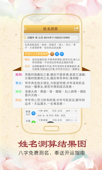 1.姓名测算:紧密结合姓名、生辰八字与性别,精确预测姓名优劣及运势吉凶!免费提供改名的旺运用字和开运指南!2.公司名测算:轻松预测公司名字的前景吉凶,钱途好坏!