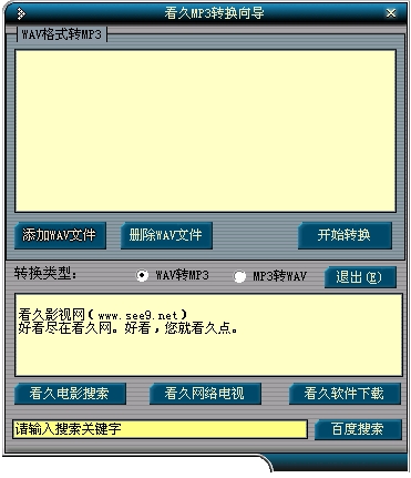 免费简约的MP3转换工具,支持WAV转MP3,MP3转WAV。转换速度快,转换后生成的新文件与源文件默认在同一目录中,文件名只是扩展名不同。提示:WAV格式一般比相应的MP3文件大很多,转换时请注意。