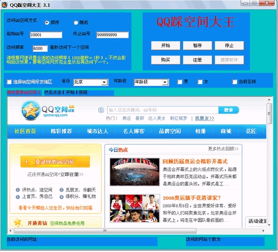 QQ踩空间大王 V3.1 简体中文绿色特别版 通过高速自动访问亿万QQ用户空间,达到回返自己空间效果
