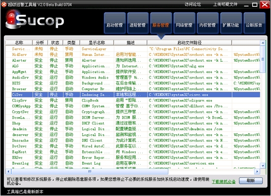 超级巡警的工具箱为从超级巡警中剥离的分析功能,并使用内核驱动技术增强后的一个工具箱。由于使用了大量的内核技术,虽然我们经过了大量的测试,但是还暂时无法保证软件的稳定性,在使用过程中可能出现蓝屏,建议大家谨慎使用。