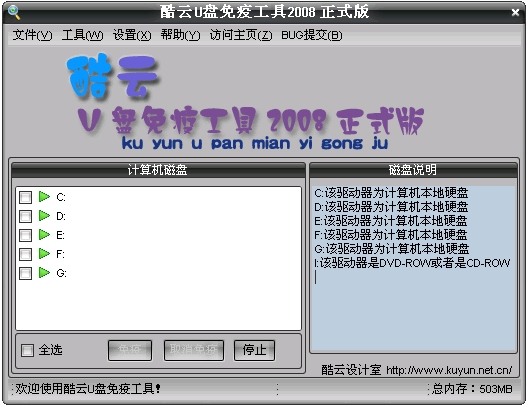 酷云U盘免疫工具 2008 简体中文绿色免费版 该软件为V1.0.0正式版本,本工具可在各个磁盘(本地磁盘和移动磁盘)中生成免疫文件,免疫过程有进程查看,随时随地终止或开始免疫功能!每个磁盘可查看磁盘类型,让您的计算机更安全!具体使用方法您可以参考本软件。如果在使用过程中有任何问题,欢迎您建议