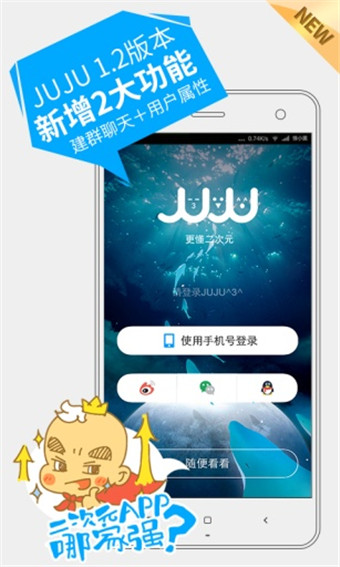 JUJU,纯二次元团队打造的,专注于二次元的社交平台!只针对二次元人群,构建最有爱的社交平台!不用关注也有话题,不用粉丝也能分享,只看自己感兴趣的,只认识自己同兴趣的!一切为了二次元,为了所爱的二次元。【软件特点】