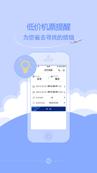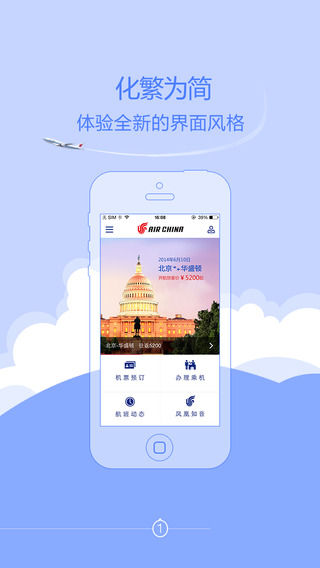 支持300余条国航承运国内、国际航线,155个目的地城市的特价机票查询预定提供语音识别。设定多种价格、舱位、机型、经停条件筛选航班。