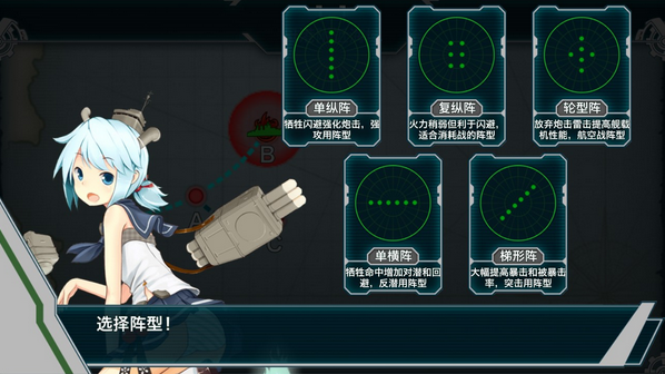 《战舰少女》中,开始战斗时,玩家需要选择这场战斗的阵型。不同的阵型对玩家舰队有不同的属性提升,请根据敌我双方情况选择适合的阵型。