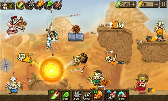 游戏中共有120个关卡,玩家可以直接瞄准僵尸进行射击,也可以射击建筑物用以压倒成片的僵尸群。同时玩家也可以为箭装上炸弹,射出去之后可以在一定范围内制造爆炸效果,另外还有4种不同的射击模式有待探索。【射箭闪电战游戏评测】