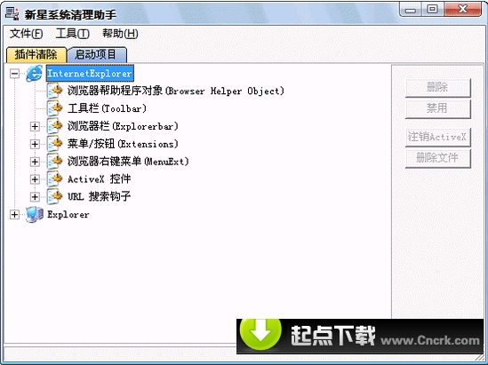 新星系统清理助手 V1.70 简体中文绿色免费版 通过此软件可以查看 IE 浏览器被安装的以下插件,并可以对其进行删除、删除插件文件、注销ActiveX 控件等操作。还可以方便的恢复被锁定的IE主页。可以清理随Windows启动的项目。