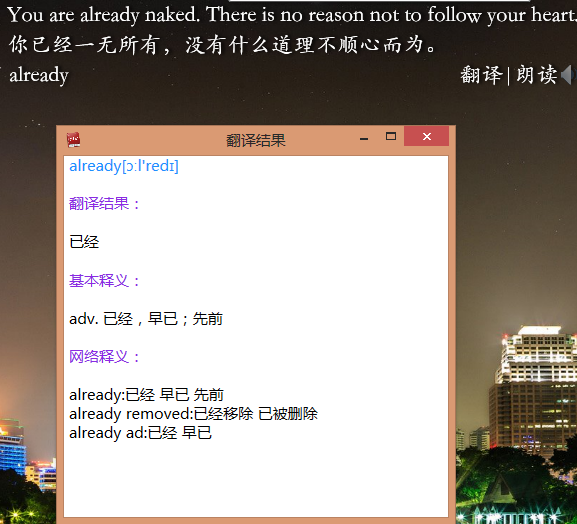 现在的翻译软件功能越来越多,也越来越臃肿,还不时弹广告,真的很烦恼。鉴于这种情况,自己做了个翻译软件,名字叫做DailySentence,能满足日常需求就好了。需要用的时候可以直接在桌面输入单词翻译,或者直接使用快捷键呼出翻译窗口。最重要的是拒绝广告。