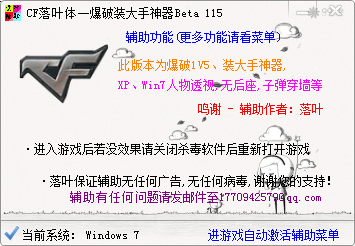 CF落叶体验服一区爆破装大手神器是一款只适用于体验服一区使用的CF辅助工具。该工具具有人物透视、子弹穿墙、无后坐力等功能,有了该辅助,玩家在游戏中将会披荆斩棘,所向披靡!