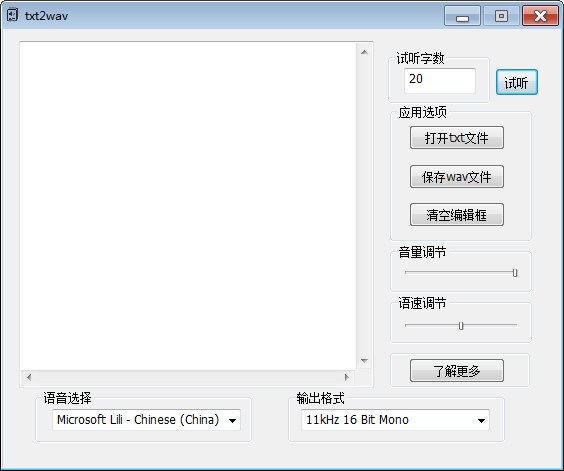 文本转换语言工具是一款可以将文本转换成语音的小工具。该工具小巧不占内存,且绿色无病毒,简单易用。它是根据网上txt2mp3,Balabolka等工具仿制,可以说应用范围很广。