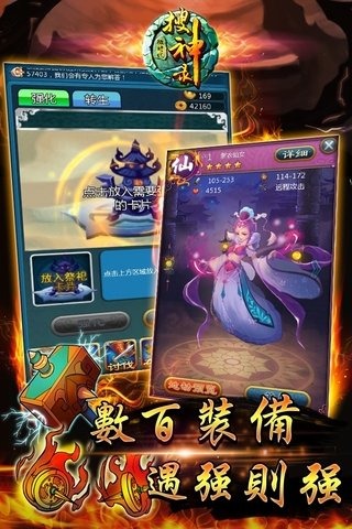 1、全新的玩法和操作体验,指尖滑动释放各式仙术技能;2、孙悟空、嫦娥、妲己、鸿钧、蚩尤等400多名熟悉的神话人物、法宝等你来收集;