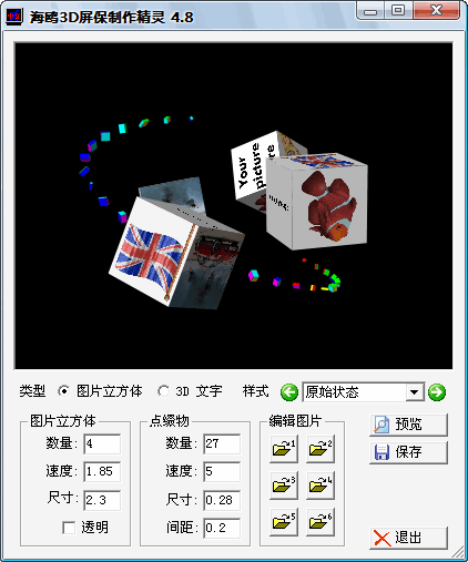 海鸥3D屏保制作精灵 V4.8 简体中文绿色免费版 海鸥3D屏保制作精灵是一个功能无比强大的3D屏幕保护程序制作工具,素材可以是图片、动画、视频avi等文件格式。它帮助你在几秒中内就可以轻松制作出一个具有专业水准的3D屏幕保护程序,程序采用人性化设计,将各种菜单,对话框,选项等设置做到最简单化,再加上内置的几十种图片,文本特效,让你只需要进行简单的设置就可以轻松制作出非常精美的3D屏幕保护程序,支持预览功能,支持透明效果,支持自定义屏幕保护分辨率,非常容易使用.