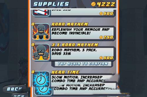 游戏的视角颇为独特,人物是从屏幕左侧向右侧移动,而射击方向却是正前方,这一设定很像街机游戏厅里VR战警等光枪游戏。除了特定场景需要跳跃外,其他的移动过程完全不需要你管。至于射击嘛,简直就是步步高点读机,想打哪里点哪里。瞄准什么的根本不需要,你只要像打地鼠一样又快又准的点到冒出来的敌人头上就可以了,当然游戏中掉落的武器道具和补给是不能放过的。酣畅打击 代入强烈