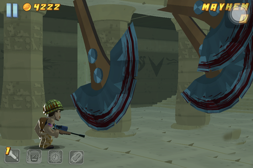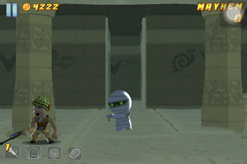 致命伤害 Major Mayhem这是一款拥有非常简单的故事情节和独特视角的射击游戏,游戏中主角从屏幕左侧向右侧移动,却向正前方射击,很像街机游戏厅里玩过的光枪游戏。除了特定场景需要跳跃外,其他的移动过程完全不需要你管,你只需把你的手指当成光线枪,又快又准的点到冒出来的敌人头上就可以了,当然游戏中掉落的武器道具和补给是不能放过的。【致命伤害游戏特色】