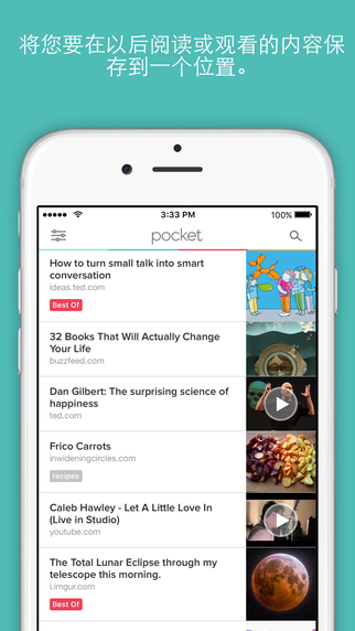 尽管保存您需要的内容,因为 Pocket 会在您的列表中突出显示最佳和最相关的内容。