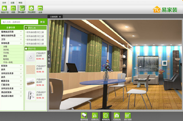 内置丰富的素材模块,主材,家具,电器等产品,一应俱全,且图像逼真。平面图,立面图,透视图都可及时出图。模拟真实家居空间,为消费者提供电子样板间。