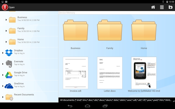 保存在本地或云:的TextMaker HD不仅打开和保存在你的Andr??oid平板电脑的文档,而且在云:直接从TextMaker HD,你可以编辑的Dropbox,谷歌驱动器,Evernote的文件, OneDrive。