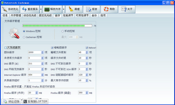 Cacheman 是一个优秀的Windows系统缓存优化工具,程序通过优化缓存控制内存来提高电脑程序的运行速度和性能,通过调整内存设定,让电脑执行效率达到最佳化。 同时也是一款利用硬盘空间产生缓存的工具,可自行调整硬盘空间数值增加更多的虚拟内存,加快应用程序的执行速度等。