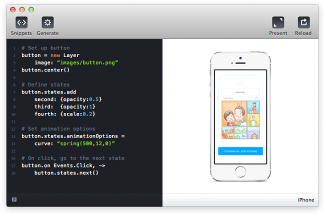 利用它可以创造出和 Carousel,Google Now 这些 app 一样的复杂交互。另外它还提供了一个 The Framer Generator,可以方便的让设计师把 Photoshop 或 Sketch 里的设计图导入到 Framer.js 里面,而这次 Framer Studio 的发布,让这一创作过程更加简便了,极大了方便了设计师,并且之前内测时也得到了包括 Facebook,Dropbox 等公司的顶级设计师们的一致好评。