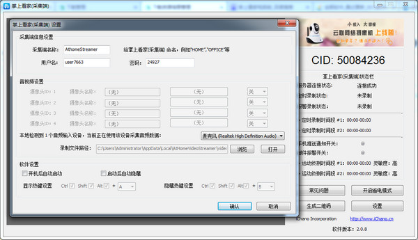 6、在采集端设备上打开“掌上看家采集端”,将您会得到一个唯一的设备连接号(CID)和随机生 成的默认用户名及密码;
